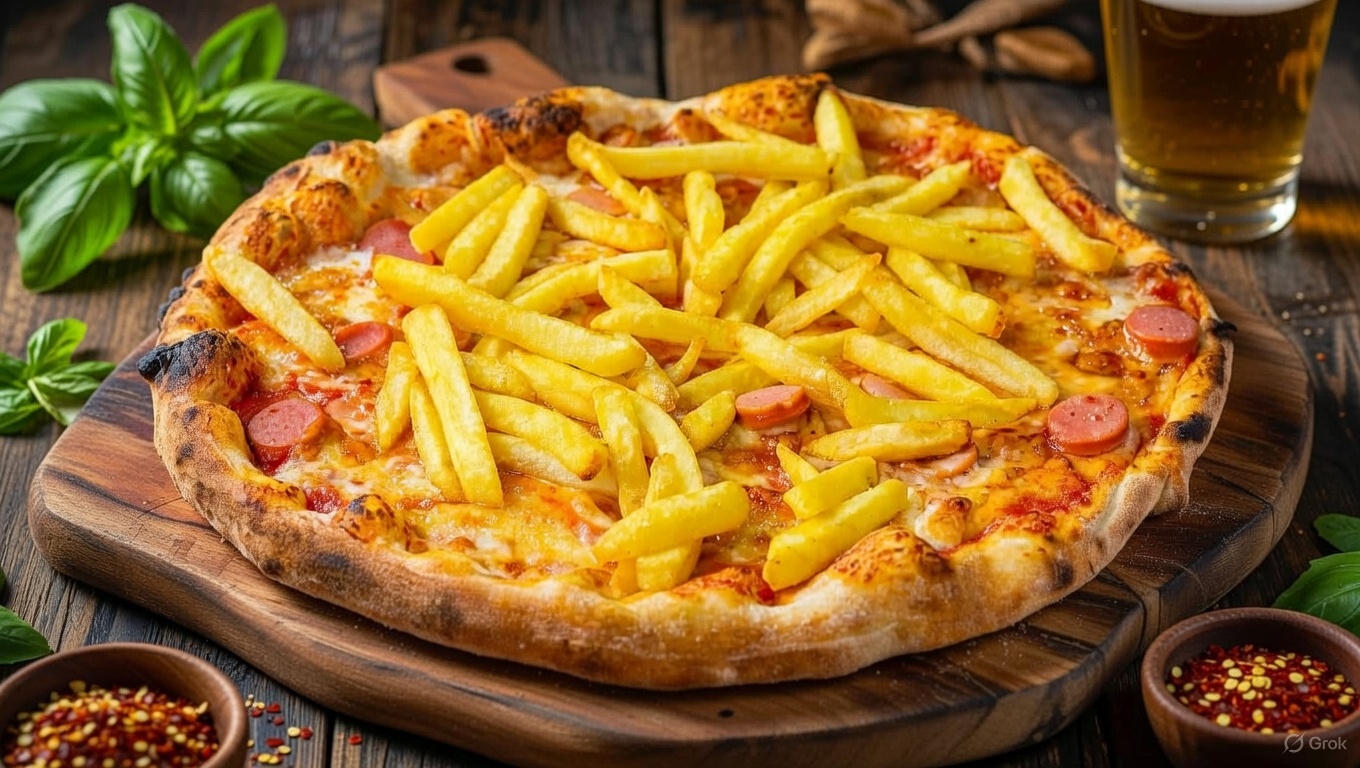 Ingrediente: blat, sos de rosii, mozarella, crenvursti, cartofi prajiti 400/420 gr , 33 cm