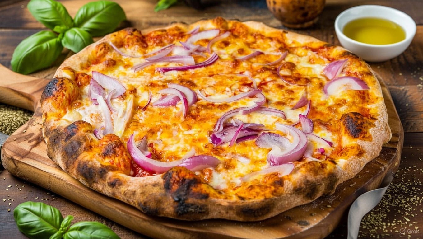 Ingrediente: blat, sos de rosii, mozzarella, ceapa rosie 300/350 gr , 33 cm